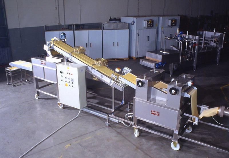 Les lignes et installations pour les nouilles peuvent être composées de : Presses pétrisseuses jusqu’à 300 kg/, Laminoirs automatiques jusqu’à 600 mm de largeur de feuille, Laminoirs et coupeuses automatiques, bandes de refroidissement, Pasteurisateurs à gaz ou à vapeur jusqu’à 7 mètres, Pré-séchoirs, Refroidisseurs, Conditionneuses verticales automatiques pour enveloppes en avec ATM.